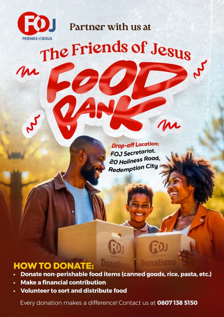 The vision of the FOJ Food Bank is to make our community hunger-free by building a food bank where the needy within redemption city and its immediate environs can regularly draw foodstuff for sustenance and where donors can also deposit foodstuff as well.